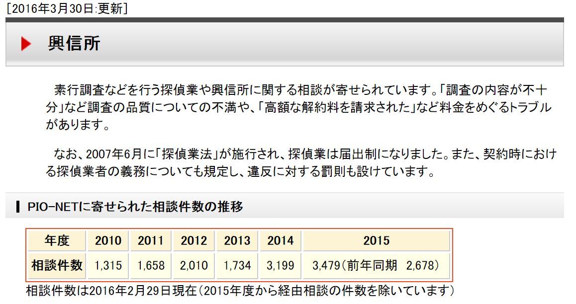 残念なことに、探偵業の中には”悪徳探偵社”が多く存在いたします。過去5年「独立行政法人国民生活センター」へ苦情の相談が後を絶ちません。下の図は2016年2月29日現在、国民生活センターに相談の合った件数です。