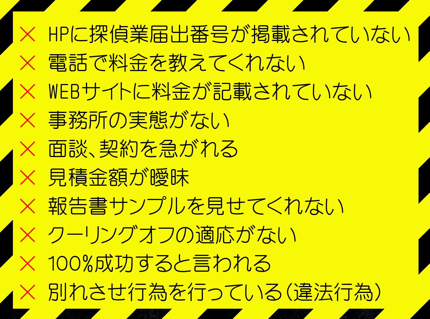 まずは、下記のような特徴のある悪徳探偵社にはくれぐれもご注意して頂き、選んでいただく指標となれば幸いで御座います。