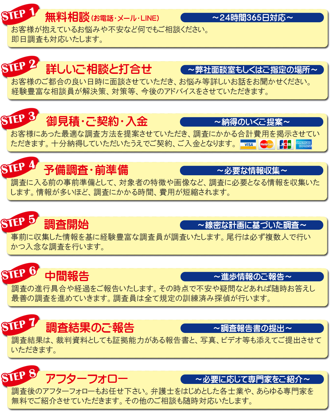 WEBサイトを見ていると全国対応の探偵社が多いと思いますが、実際には事務所等も無く、電話番号だけ表記し「転送電話」を使い集客しているところも少なくありません。しかし、そういった方法で集客してしまうと、実際の調査では交通費等高額になってしまうためどうしてもお客様に対し高額請求になってしまいます。そういったところから、横浜総合探偵社は受注範囲を一定に絞っております。その為、面談、調査開始まで非常にスピーディーに行う事が可能です。もちろん調査中対象者がエリアから離れた場合は全国どこまでもしっかりと尾行調査いたしますのでご安心ください。 ※現在調査エリア拡大中